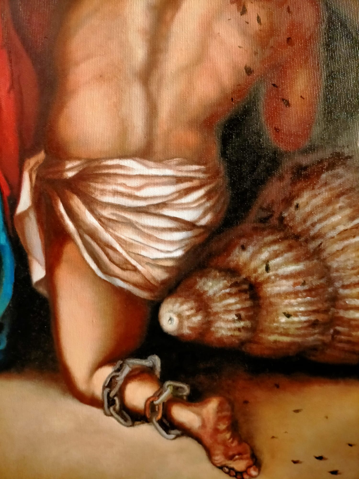 Beside her, the man bows in humility; his chains are half-loosened because true freedom begins when one stops struggling alone. At the center, Mary acts as the bridge of light: with one hand she welcomes us without judgment, and with the other she receives divine Grace in order to pour it out upon us. It is a total abandonment into her maternal hands so that, through her, we may be led toward the eternal.