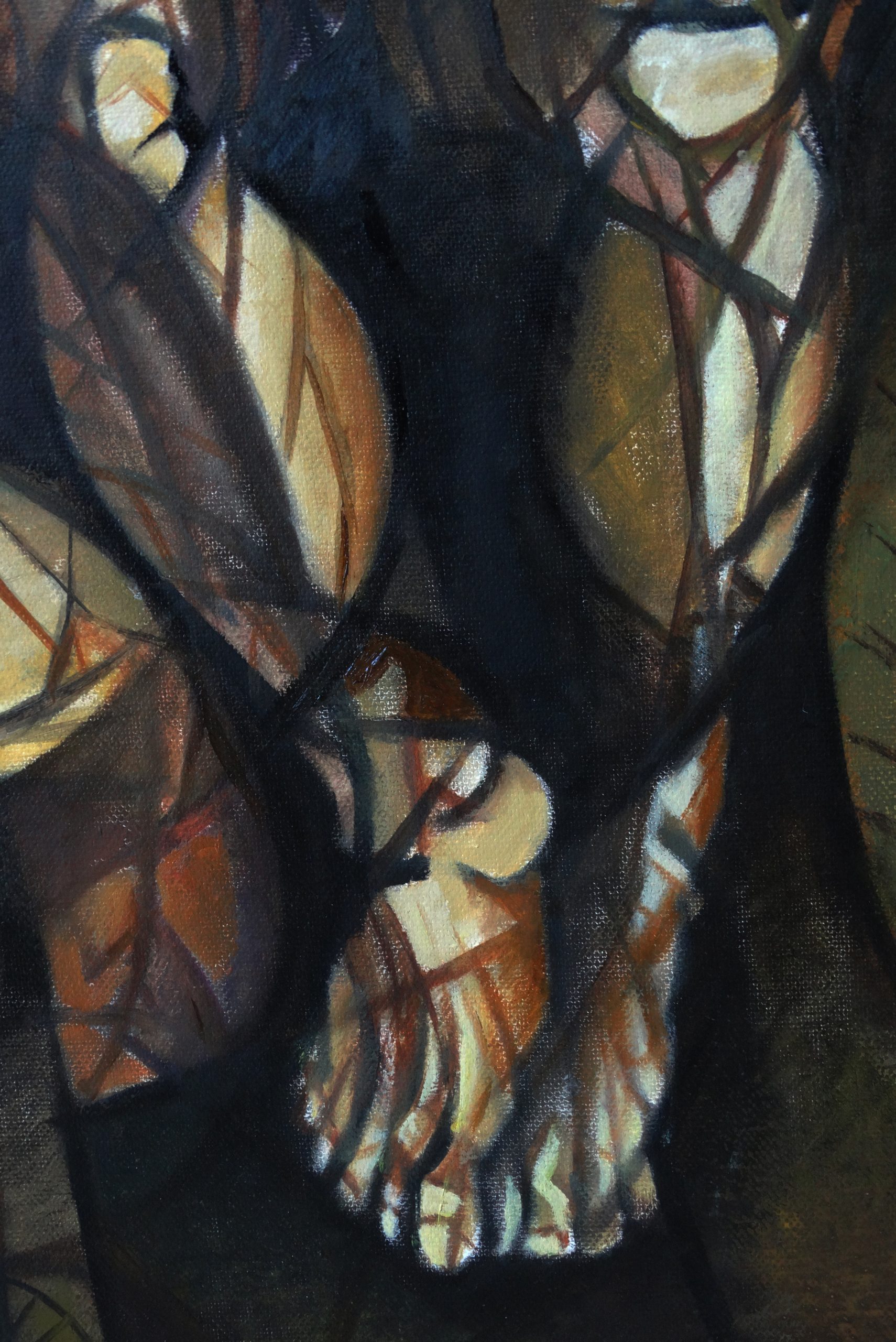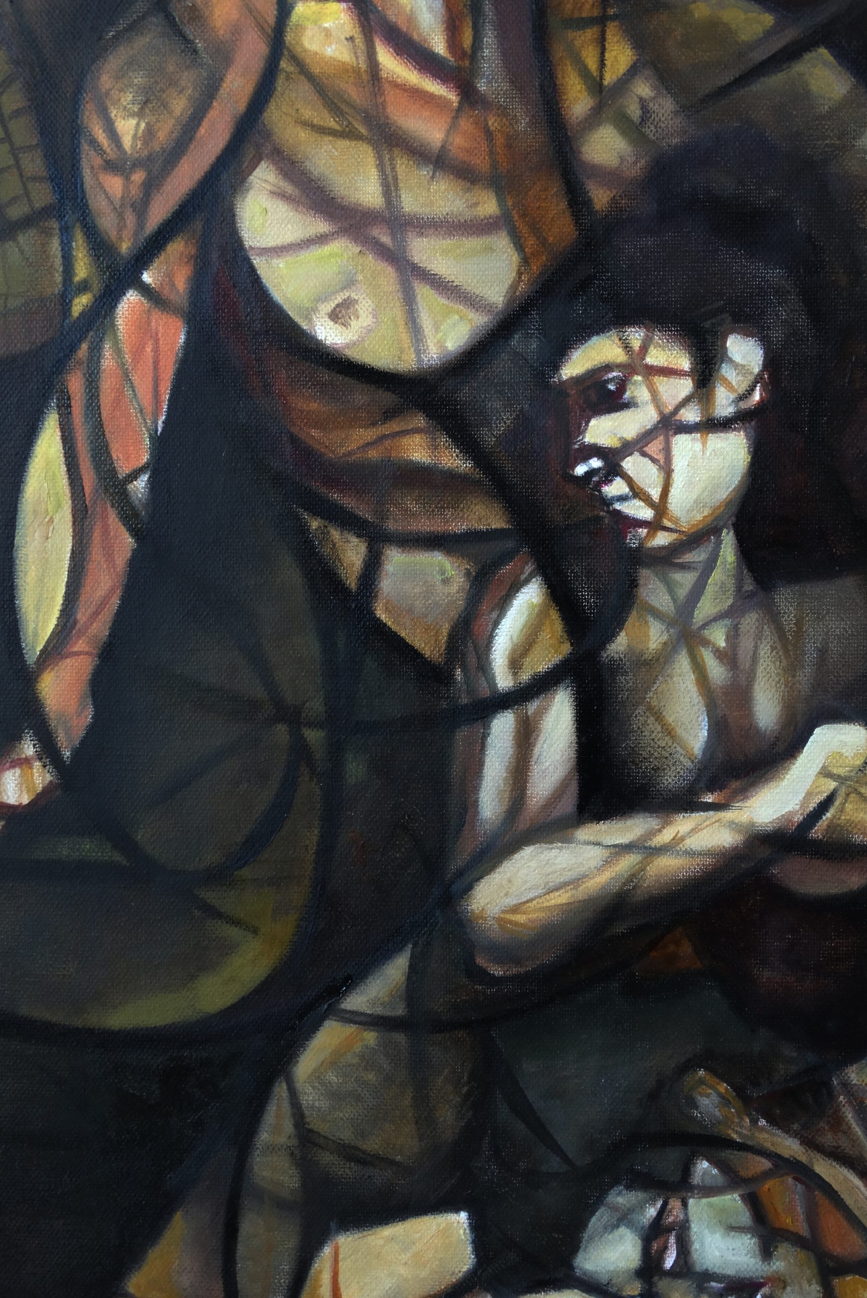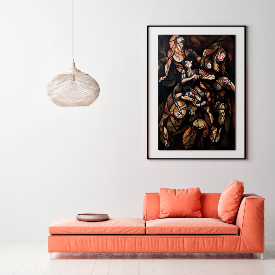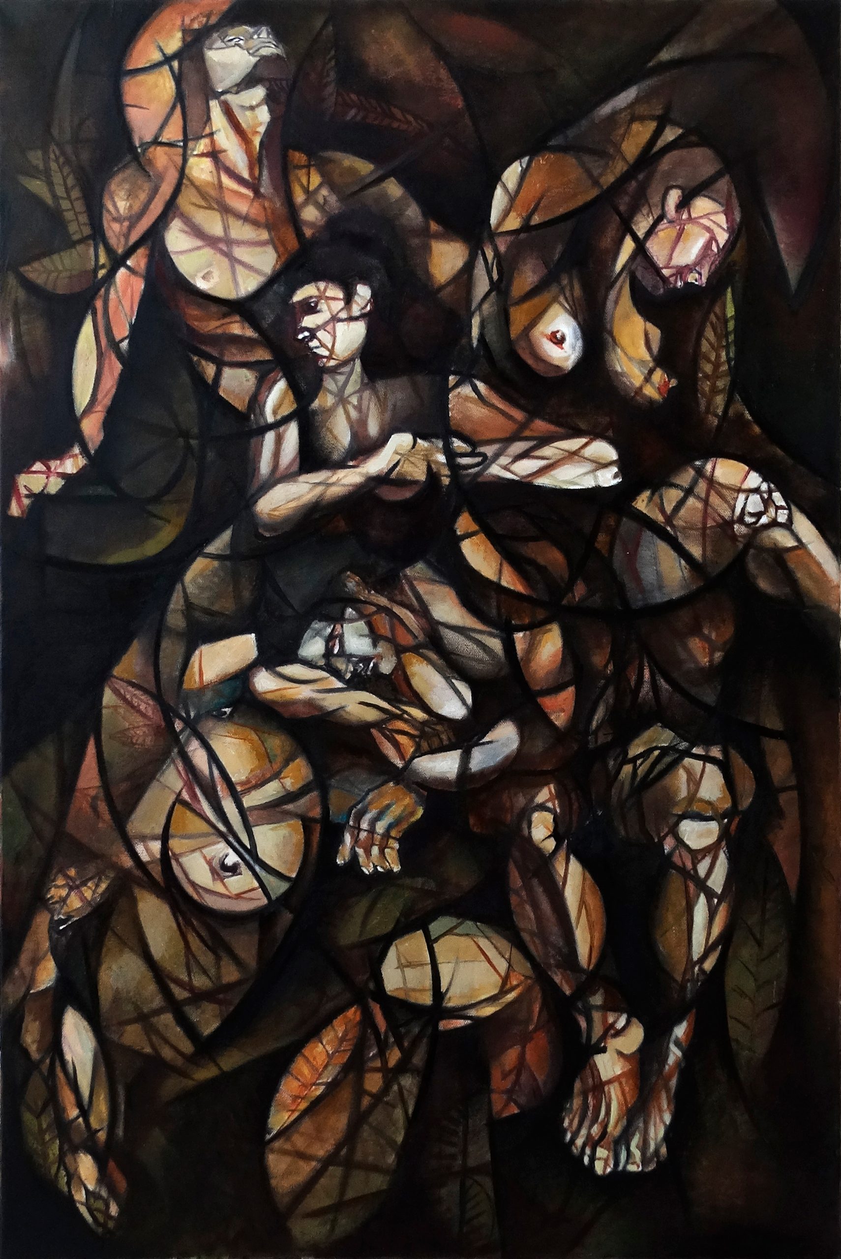La obra evoca una atmósfera de tránsito emocional y existencial donde las figuras humanas, desdibujadas y entrelazadas, parecen estar atrapadas en un espacio sin tiempo definido.