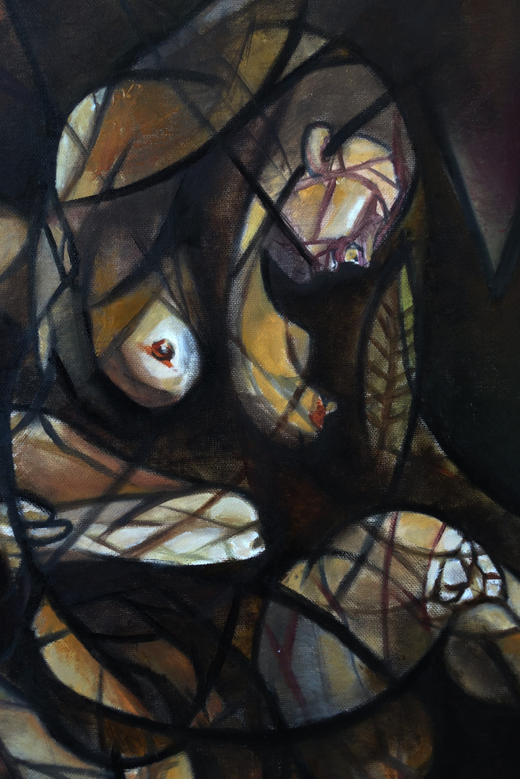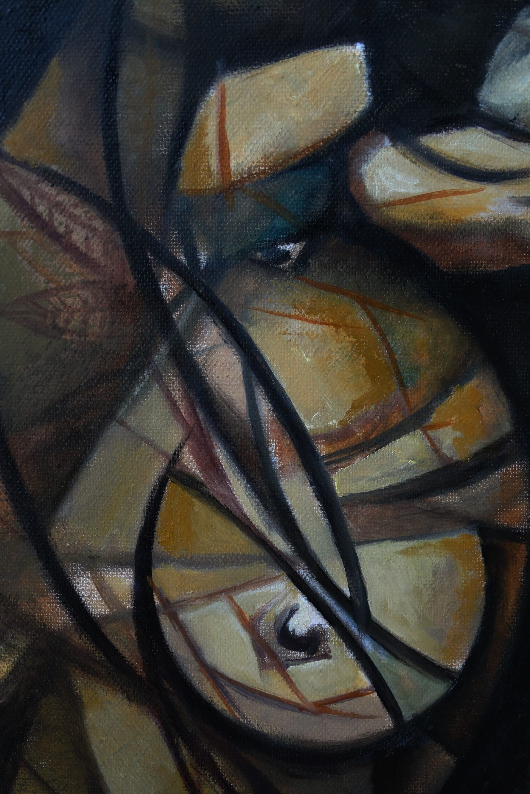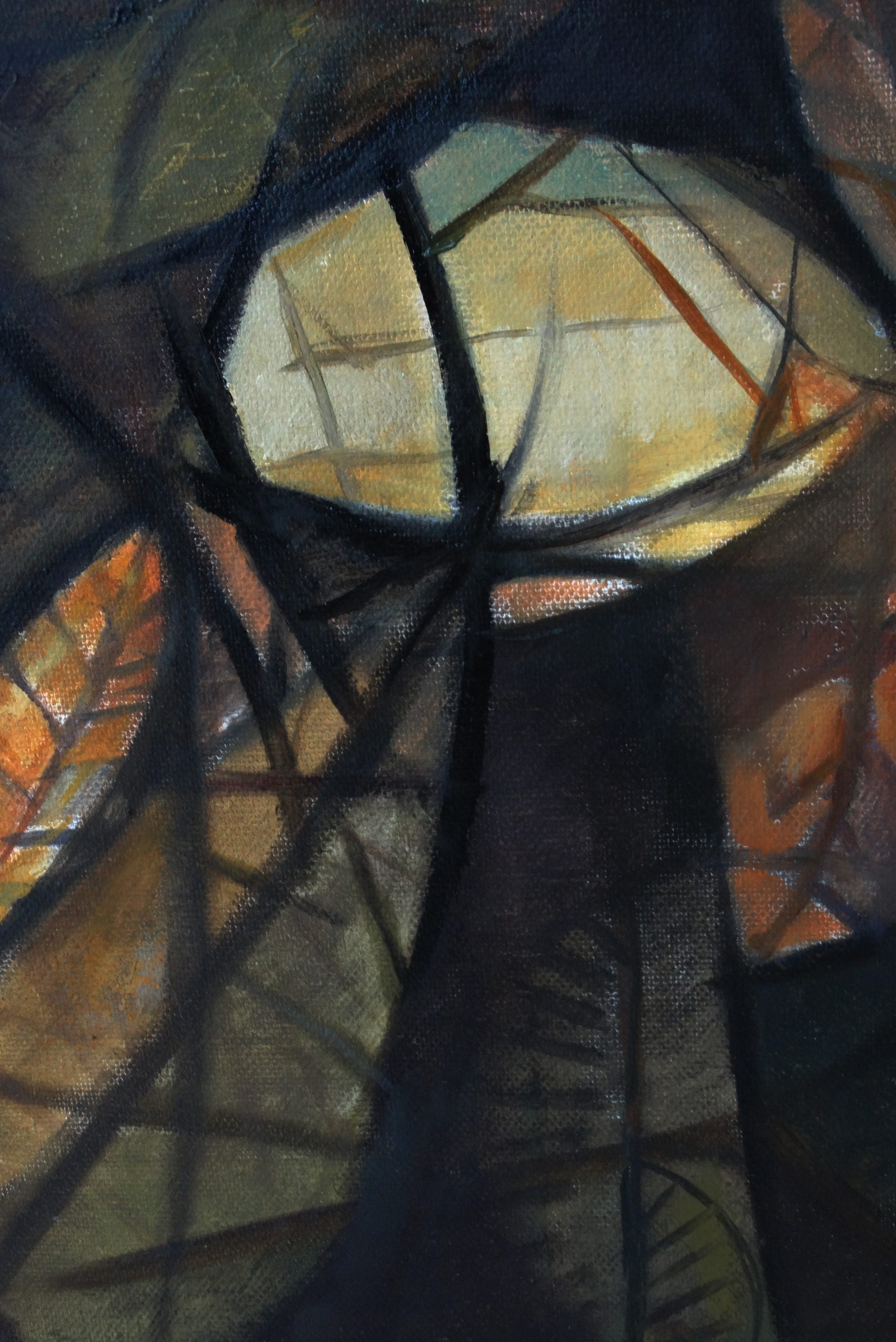 La obra evoca una atmósfera de tránsito emocional y existencial donde las figuras humanas, desdibujadas y entrelazadas, parecen estar atrapadas en un espacio sin tiempo definido.