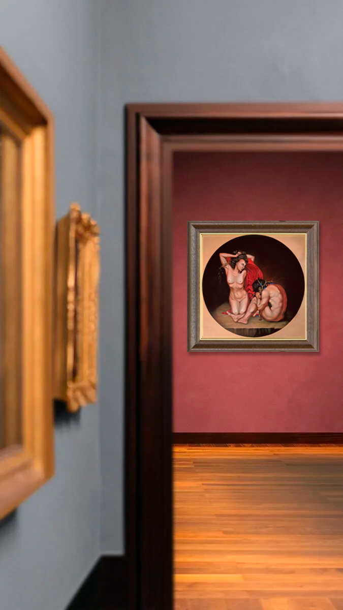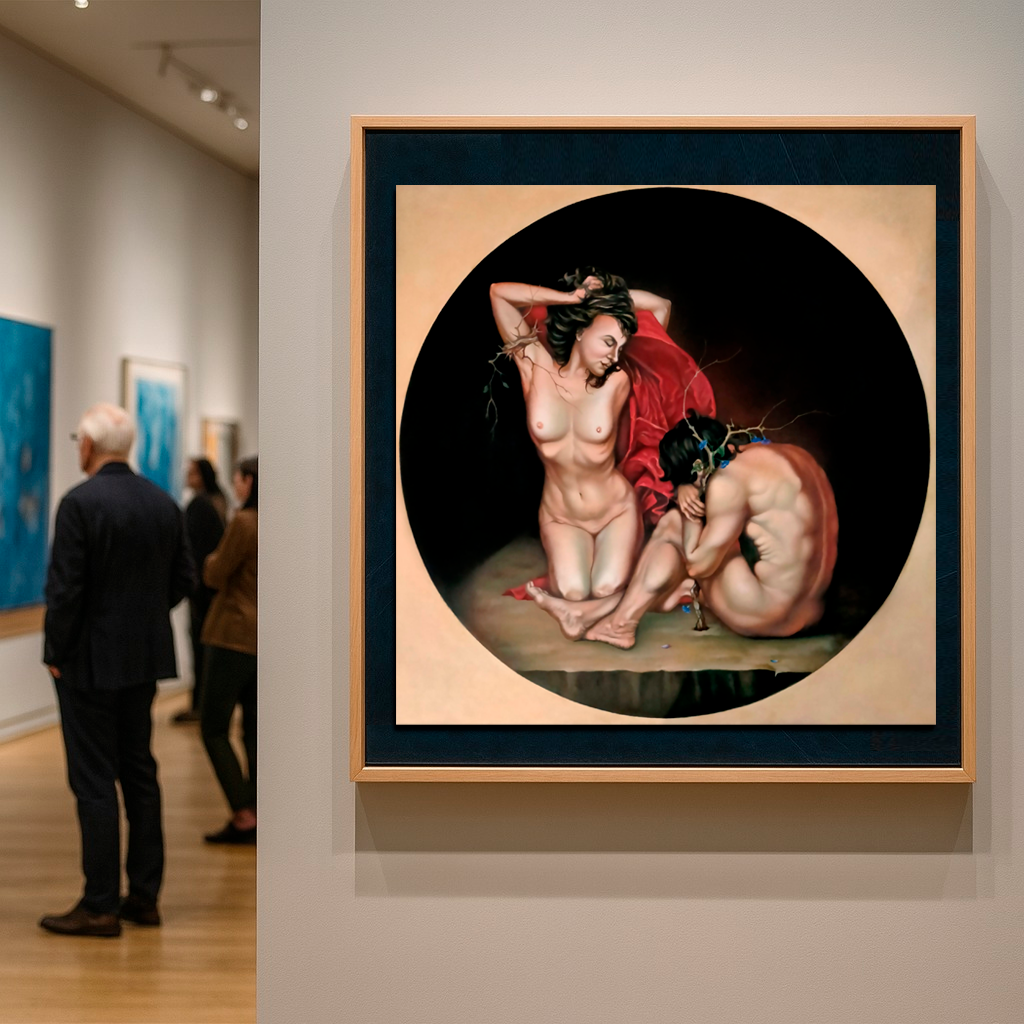 The enclosed, circular space traps the figures within a shared mental state, where desire, guilt, and fear coexist without resolution.